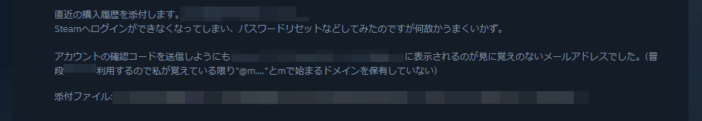 Steam運営からしてみれば、この問い合わせ者がハッカーの可能性もあるわけで。ファイル添付が行えるので、なるべくアカウント所有者本人しか知り得ない情報を添付しましょう。私の場合はメールから直近3つの購入履歴画像(メール受信時刻なども見えるようにした状態のもの) を添付しました。